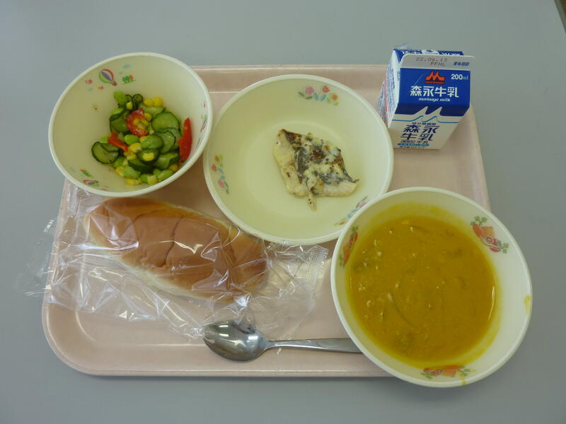 6月2日(木)の給食(ミルクパン 牛乳 かぼちゃの豆乳ポタージュ ホキのマスタード焼き イタリアンサラダ)