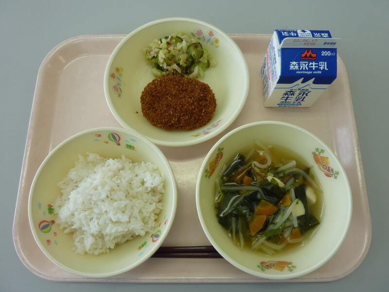 6月6日(月)の給食(麦ご飯 牛乳 わかめスープ キャベツのメンチカツ 梅かつお和え)