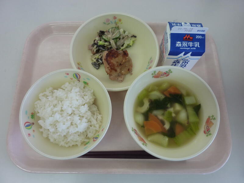 6月7日(火)の給食(麦ご飯 牛乳 チンゲンサイのスープ 鶏肉の梅焼き かみんこサラダ)