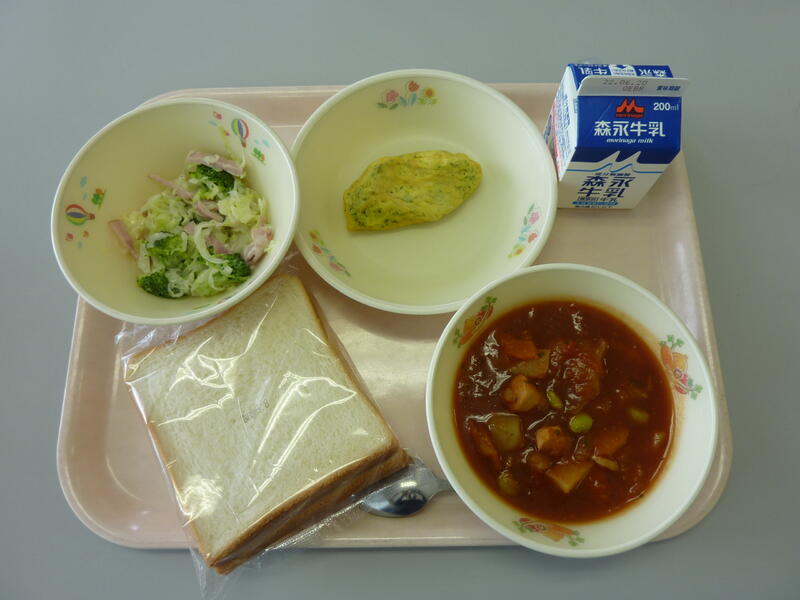 6月9日(木)の給食(食パン 牛乳 鶏肉にトマト煮込み ほうれん草オムレツ ブロッコリーのサラダ)
