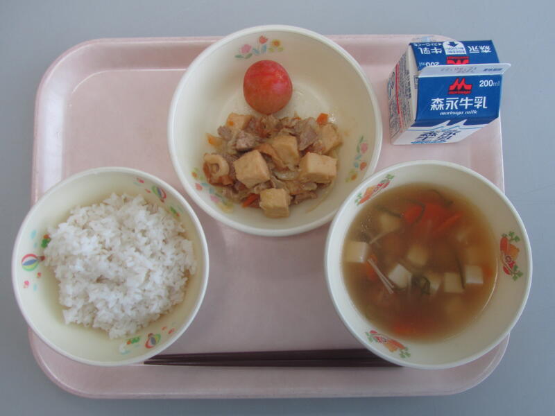 6月10日(金)の給食(麦ごはん 牛乳 根菜だんご汁 豚肉と厚揚げのみそ炒め ハニーローザ)