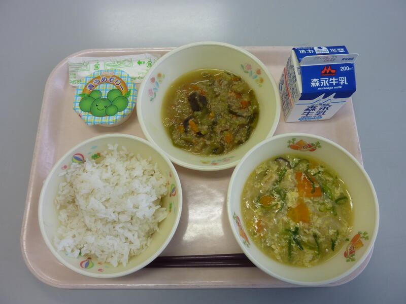 6月14日(火)の給食(麦ご飯 牛乳 南関あげの卵とじ なすのみそ炒め 梅ゼリー)