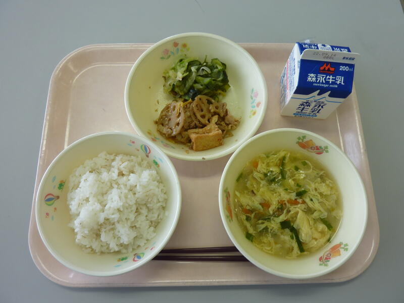 9月5日(月)の給食(麦ご飯 牛乳 にら玉汁 ピリ辛炒め カラフルサラダ)