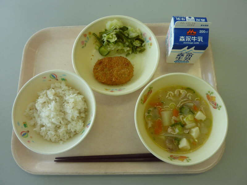 10月3日(月)の給食(麦ご飯 牛乳 キムチ豚汁 里芋コロッケ 茎わかめのサラダ)