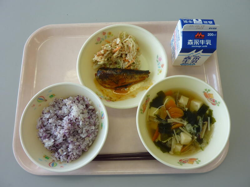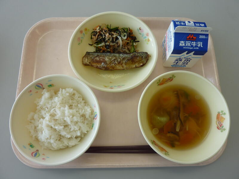 10月21日(金)の給食(麦ご飯 牛乳 お野菜つみれ汁 さんまの塩焼き ひじきのサラダ)