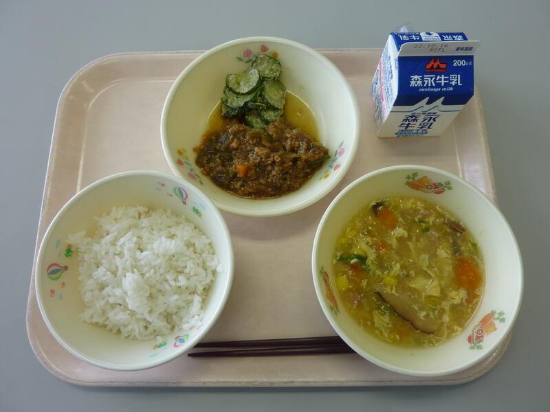 10月5日(水)の給食(麦ご飯 牛乳 スーミータン なすの肉みそ炒め ごまきゅうり)