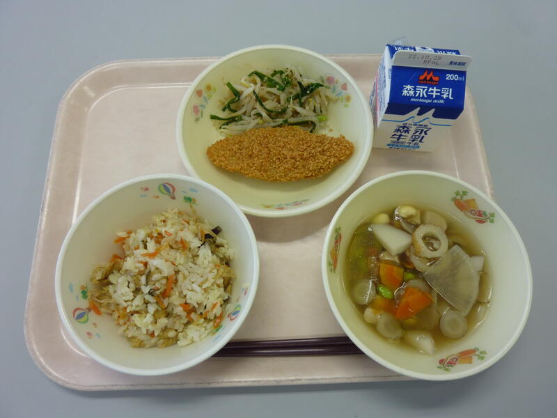 10月17日(月)の給食(文楽飯 牛乳 いちょう葉汁 ホキのカリカリあげ にらともやしの和え物)