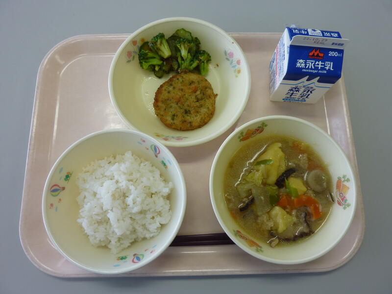 10月18日(火)の給食(麦ご飯 牛乳 かぼちゃだんご汁 豆腐と大豆のフライ ブロッコリーのおかかサラダ)