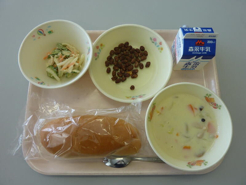 10月20日(木)の給食(コッペパン 牛乳 秋の香りシチュー ココア豆 大根とささみのサラダ)