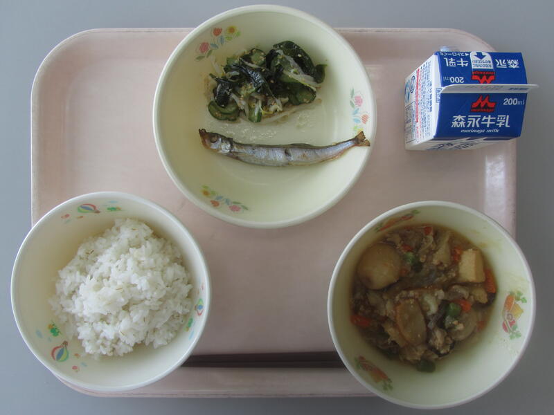10月24日(月)の給食(麦ご飯 牛乳 さといものそぼろ煮 ししゃもの香り焼き わかめのごま酢あえ)