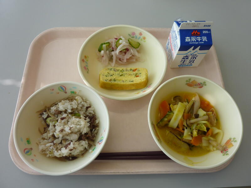 12月12日(月)の給食(馬肉ご飯 牛乳 ほうとう 千草焼き 梅肉あえ)