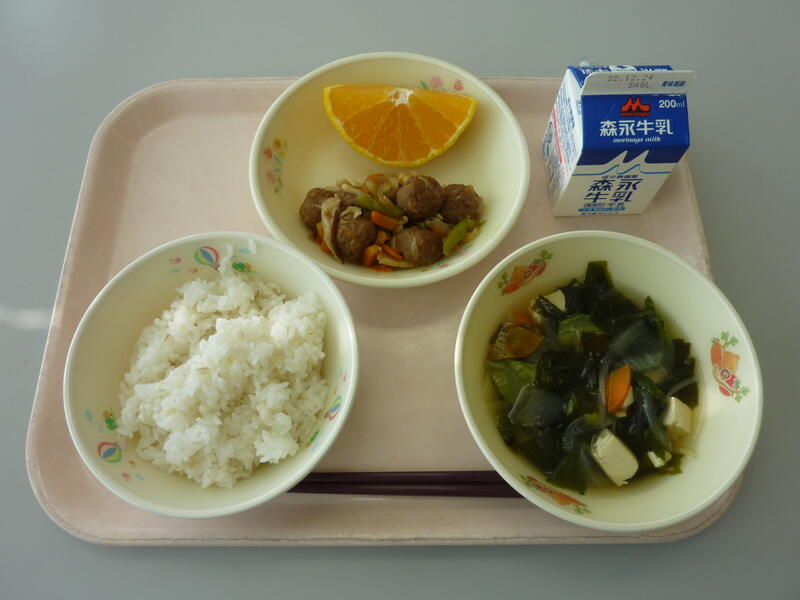 12月13日(火)の給食(麦ご飯 牛乳 わかめスープ ミートボールの酢豚風 でこぽん)