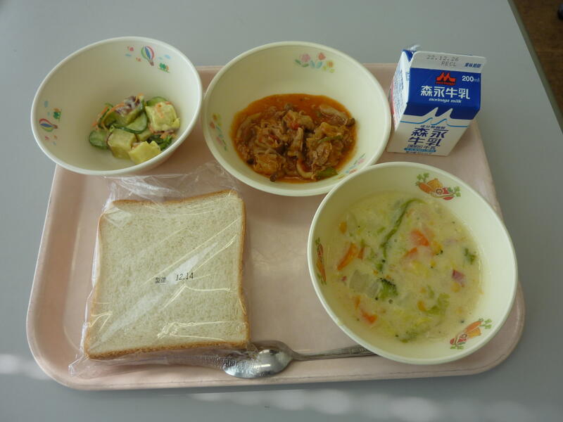 12月15日(木)の給食(食パン 牛乳 白菜のクリーム煮 ポークチャップ からいもサラダ)