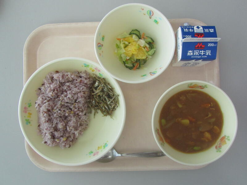 12月16日(金)の給食(雑穀ごはん、チキンカレー、青のりマヨいりこ、甘夏サラダ、牛乳)