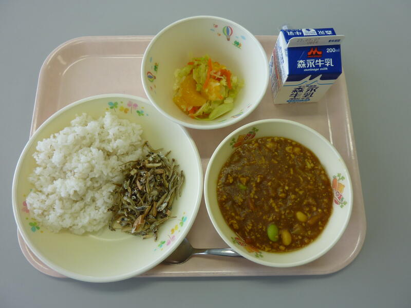 2月24日(金)の給食(麦ご飯 牛乳 畑の肉カレー アーモンドいりこ でこぽんサラダ)