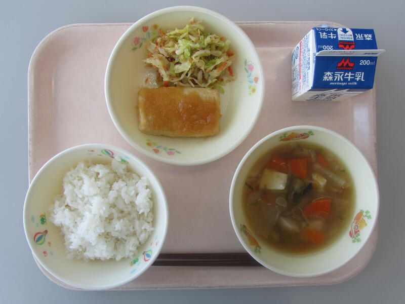 2月28日(火)の給食(麦ご飯 牛乳 のっぺい汁 豆腐の大根おろしソース キャベツのおかかあえ)
