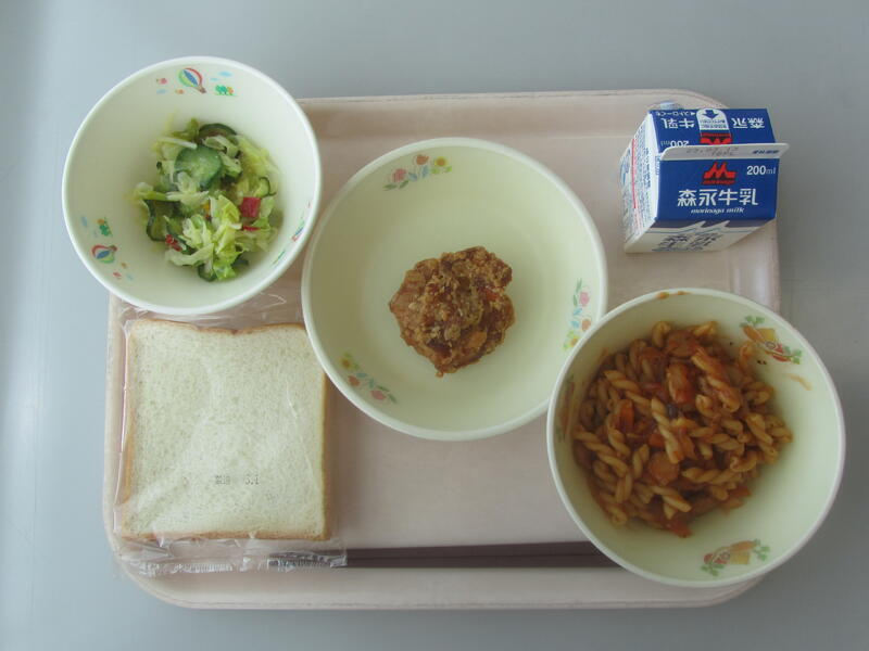 3月2日(木)の給食(食パン 牛乳 ボローニャ風パスタ 鶏のからあげ イタリアンサラダ)