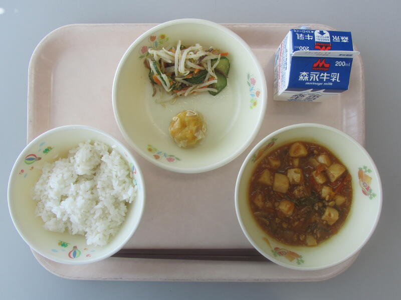3月3日(金)の給食(麦ご飯 牛乳 マーボー豆腐 にんじんシュウマイ 中華あえ)