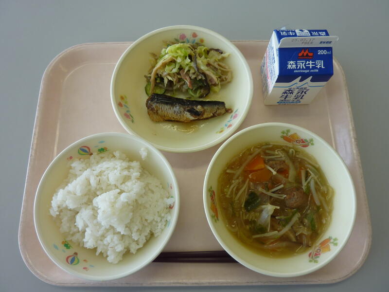 3月6日(月)の給食(麦ご飯 牛乳 春雨汁 鰯の生姜煮 かみんこサラダ)