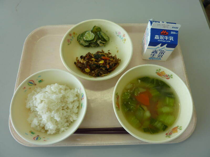 3月7日(火)の給食(麦ご飯 牛乳 トックスープ ビビンバ ごまきゅうり)