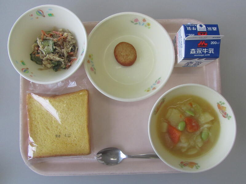 4月13日(水)の給食(米粉入り人参パン 牛乳 ポトフ チキンナゲット ごぼうサラダ)