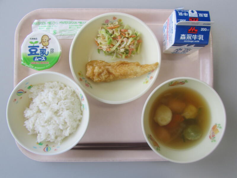 4月28日(金)の給食(たけのこごはん 牛乳 とうふ汁 鶏のからあげ 春キャベツのサラダ)