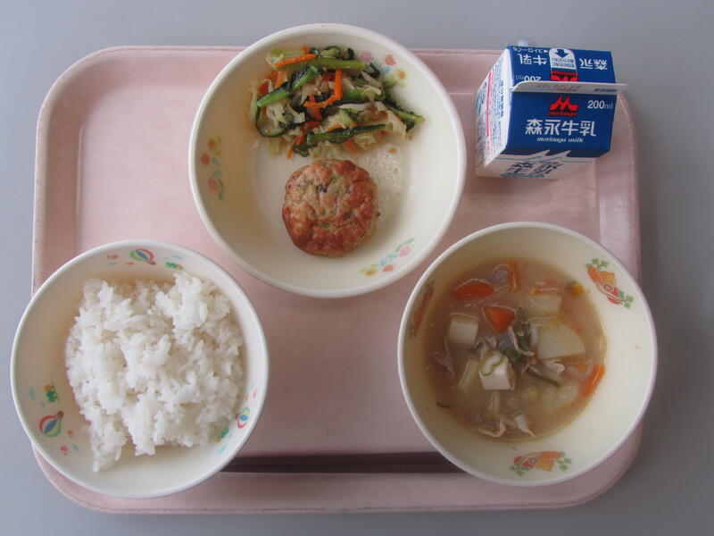 7月18日(火)の給食(麦ごはん 牛乳 お野菜つみれ汁 鶏肉と厚揚げの甘辛炒め キャベツのおかかあえ)