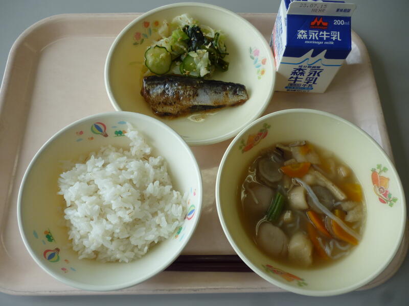 7月10日(月)の給食(菜めし 牛乳 白玉汁 ししゃものピリ辛焼き コーンときゅうりのかんきつサラダ)