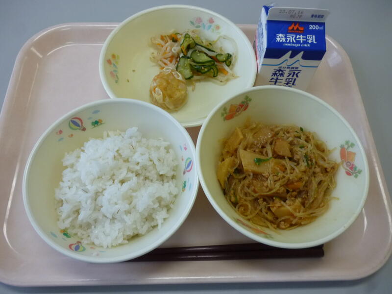 7月5日(水)の給食(麦ごはん 牛乳 マーボー春雨 にんじんシューマイ もやしのナムル)