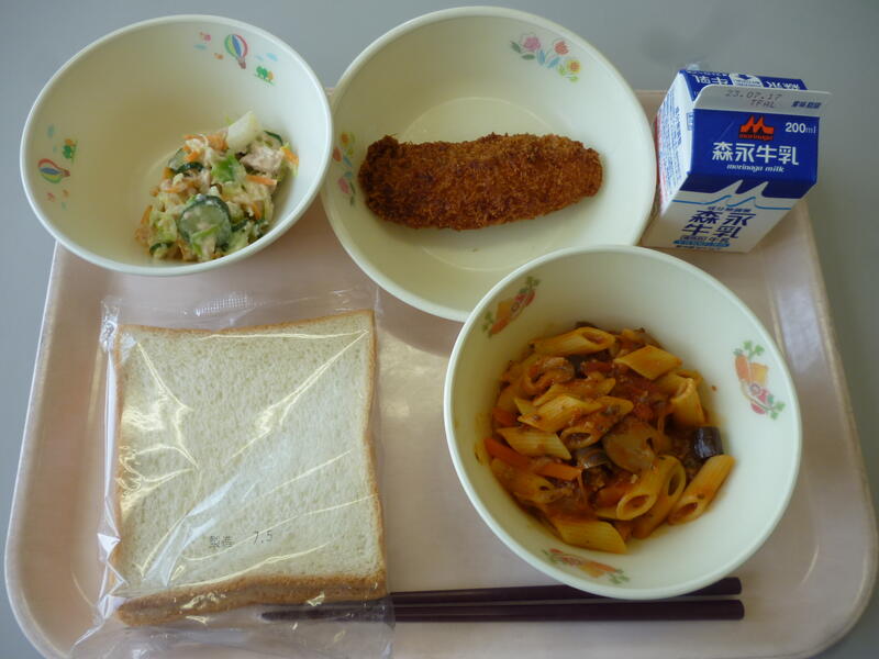 7月6日(木)の給食(食パン 牛乳 ペンネとなすのトマトソース ホキフライ ツナサラダ)