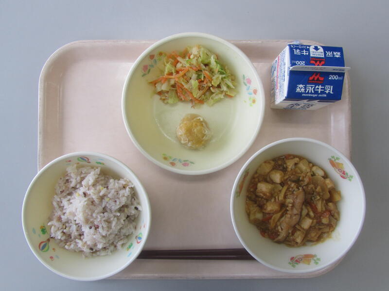 1月12日(金)の給食(雑穀ごはん 牛乳 マーボー豆腐 にんじんしゅうまい キャベツの中華あえ)