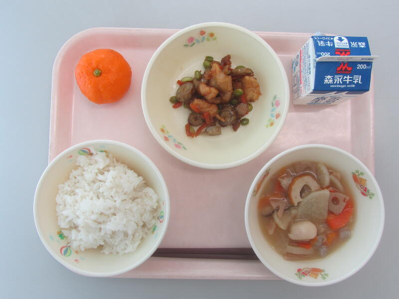 1月17日(水)の給食(麦ごはん 牛乳 大平(おおひら) チキンチキンごぼう みかん)
