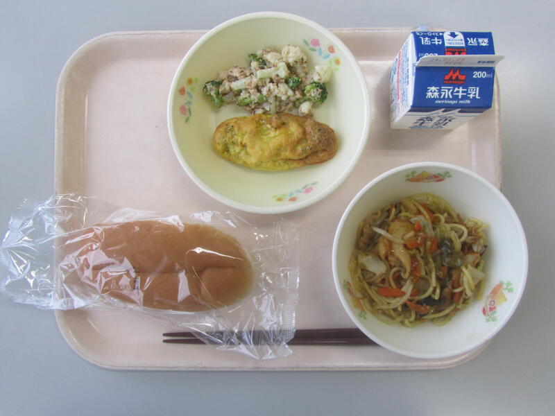 1月18日(木)の給食(たてわりコッペパン 牛乳 ソース焼きそば ほうれん草オムレツ ブロッコリーのごまサラダ)