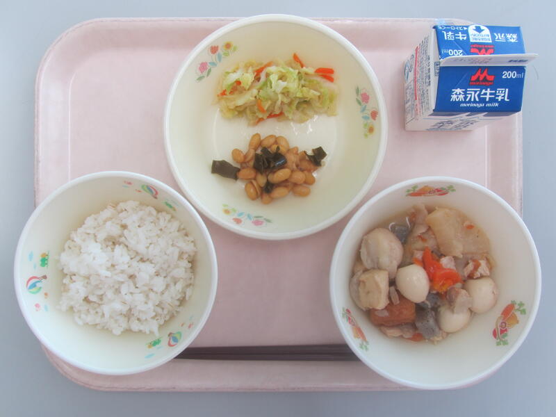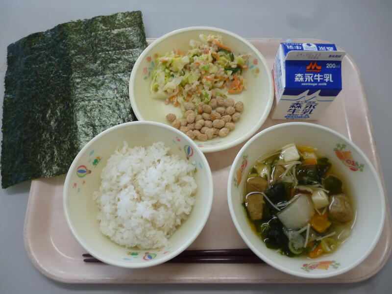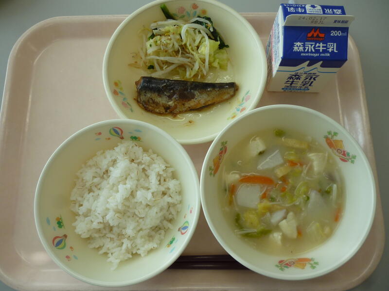 2月2日(金)の給食(麦ごはん 牛乳 いわしつみれ汁 きなこ豆 ツナあえ 焼きのり)