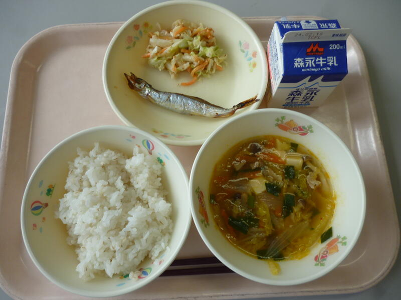 2月5日(月)の給食(麦ごはん 牛乳 キムチスープ ししゃもの香り焼き ごまネーズあえ)