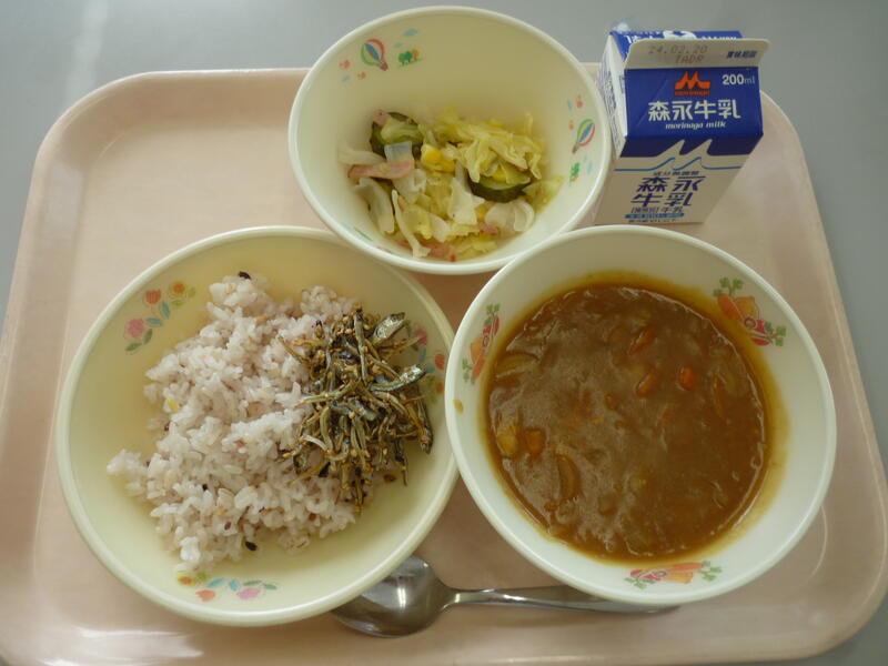 2月9日(金)の給食(麦ごはん 牛乳 野菜いっぱいカレー いりこの酢炊き こんにゃくサラダ)