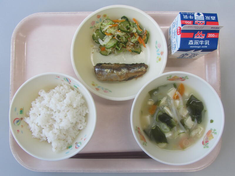 7月1日(月)の献立は、麦ごはん 牛乳 さっぱりみそ汁 いわしのみぞれ煮 野菜のごまじゃこあえです。