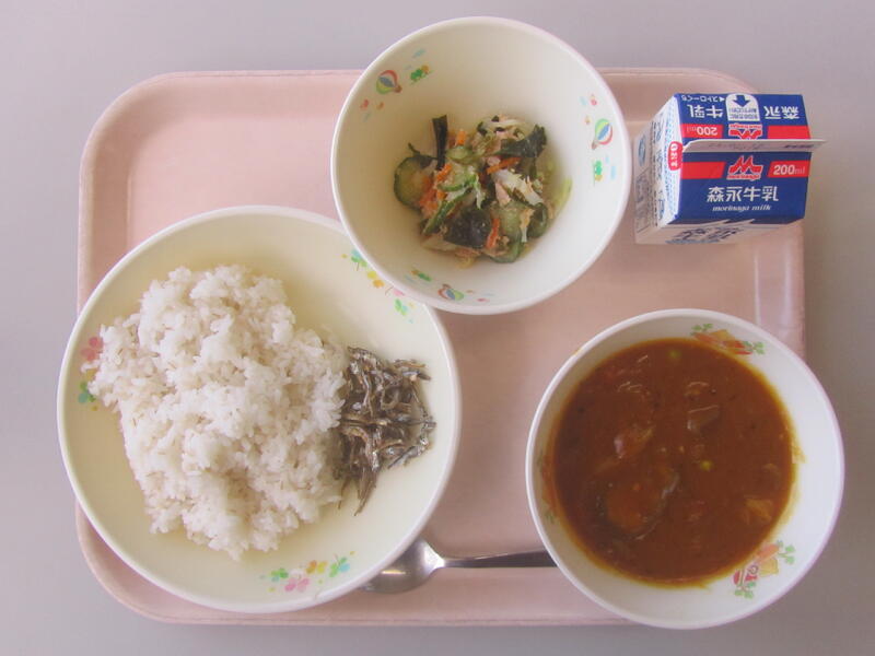 7月2日(火)の献立は、麦ごはん 牛乳 夏野菜のカレー いりこの酢炊き かいそうサラダです。