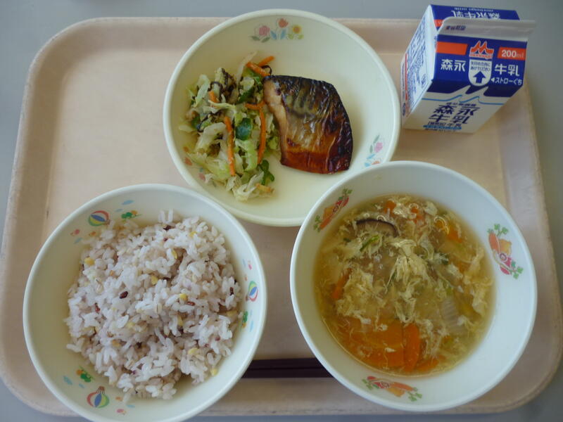 7月3日(水)の献立は、雑穀ごはん 牛乳 かきたま汁 さばのカレーしょうゆ焼き ピーマンのごま昆布あえです。