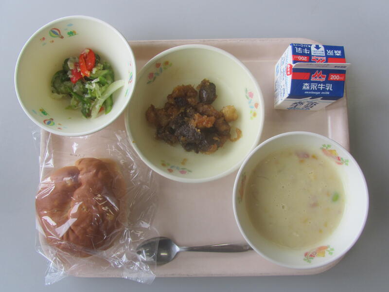 7月4日の献立は、パインパン 牛乳 コーンポタージュ レバーのバーベキューソースあえ アスパラのサラダです。