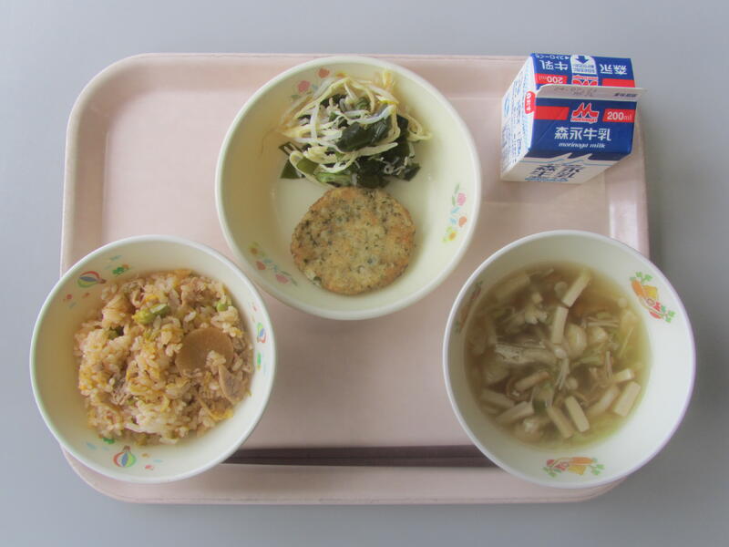 7月10日(月)の献立は、キムタクごはん 牛乳 きのこ汁 大豆と豆腐の変わり焼き いかの酢の物です。