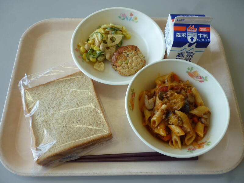 9月26日(木)の献立は、黒糖パン 牛乳 ペンネとなすのトマトソース 彩り豆腐のハンバーグ れんコーンサラダです。