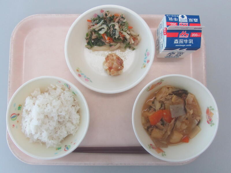 10月1日(火)の献立は、麦ごはん 牛乳 けんちん汁 いわしのみぞれ煮 もやしときくらげの和え物です。