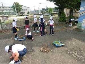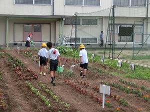 朝から、生活科園や学級園の水かけをしている子どもたち、2年生の生活科園で食べ頃のキュウリを発見しました。すぐに友だちにも知らせ、しっかり見ていました。学級園の方も、昨日の雨でしっかり根付いているようです。子どもたちは水かけを頑張っています。