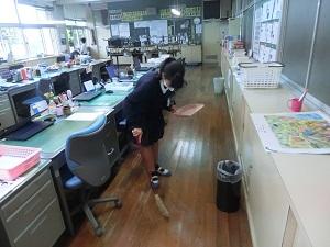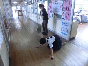伊倉小学校の掃除時間の約束は、「無言掃除」。6年生は、ほうきで掃く人・ぞうきんで拭く人の役割分担と、掃除場所の分担がしっかりできていて、「無言」で隅々まで、一人一人が自分の役割をしっかり頑張っています。みんなのお手本です。