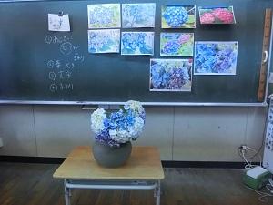 4年生教室は、子どもたちが家から持ってきてくれたアジサイの花でいっぱいです。そのアジサイの花をしっかり見ながら、絵を描きました。一つ一つの花をしっかり見ながら画いたので、力作揃いです。
