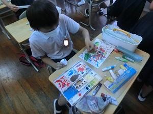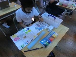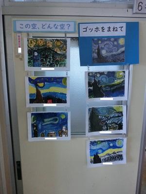 6年生の5・6時間目は図工。教室では、ポスター制作に取り組みました。今日は、背景の色つけと文字をかきました。廊下には、ゴッホの絵と見違うような、力作も発見しました。