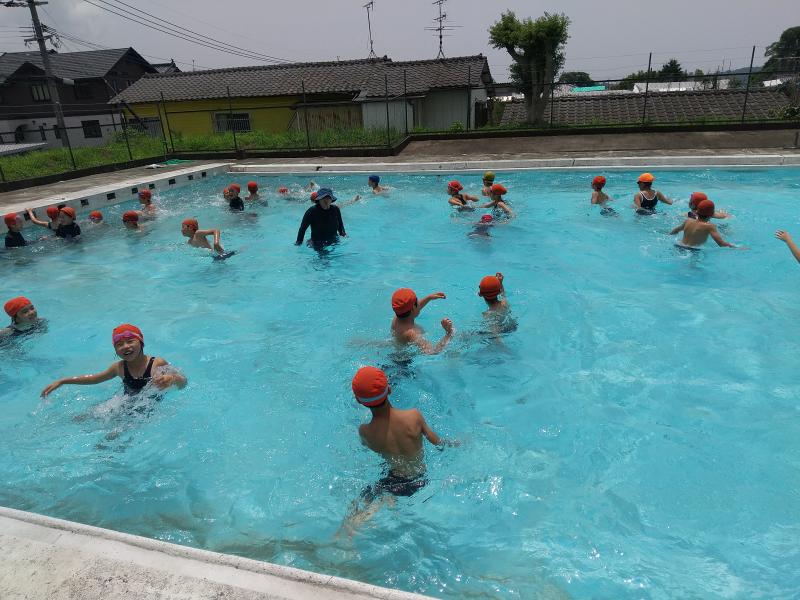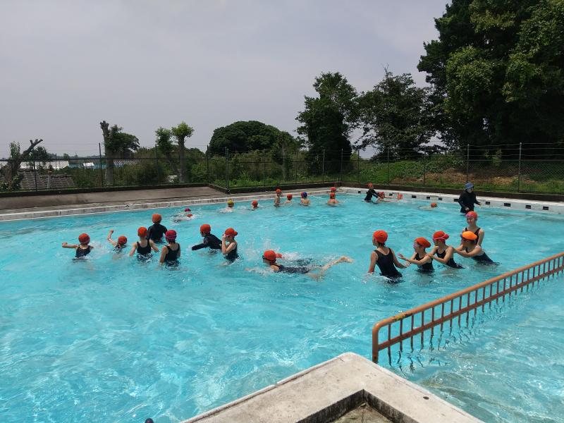 みんなが楽しみにしている体育(水泳)の時間。水に入った時にはしゃぐ様子は、低学年も高学年も同じです。歓声をあげ、とび跳ね、とてもうれしそうです。違いは、だんだんと泳ぎ方がかっこよくなり、泳ぐ距離も長くなっていきます。5年生は、準備運動と水慣れをして、クロールの練習をしています。