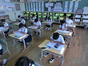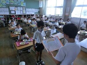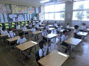 新型コロナウイルス感染がおさまらず、夏休み前の集会も校内放送で行いました。校長先生の話をしっかり聞いていた1年生に、「夏休みには、どんなことに気をつけるの?」と話を聞くと、①自分の命は自分で守ること、②お手伝いをすることと教えてくれました。