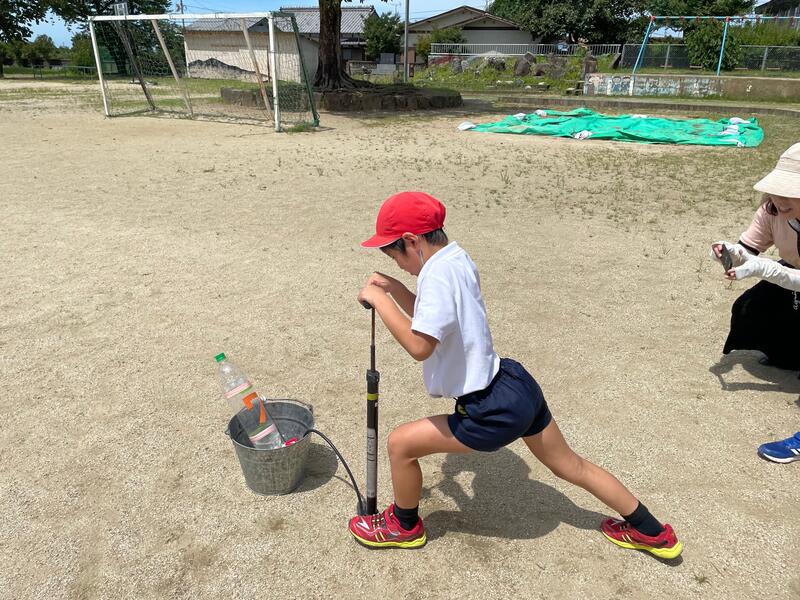 4年生は、理科の「とじこめた空気と水」の学習で、ペットボトルロケットを飛ばす実験をしました。いきおいよく、空高く上がるロケットにみんな大喜び!運動場の端から端まで飛ばした人もいました。空気を入れるとしだいに手ごたえがかたくなることなどを実感しながら、楽しく実験ができました。